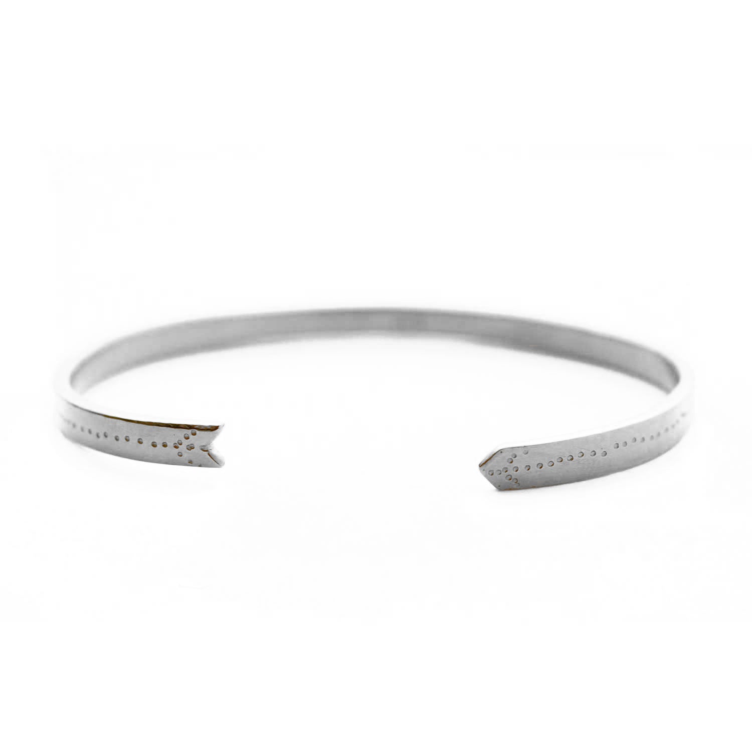 魅力的なマジックバングルをご覧ください。どんな装いも瞬時に変身させる、シンプルなステートメントピースです。それぞれのバングルに施された矢印模様は、丁寧に手作業で打ち出されており、一つ一つが唯一無二の個性を放ちます。こちらは幅3mmの細身タイプです(モデル着用写真下部)。