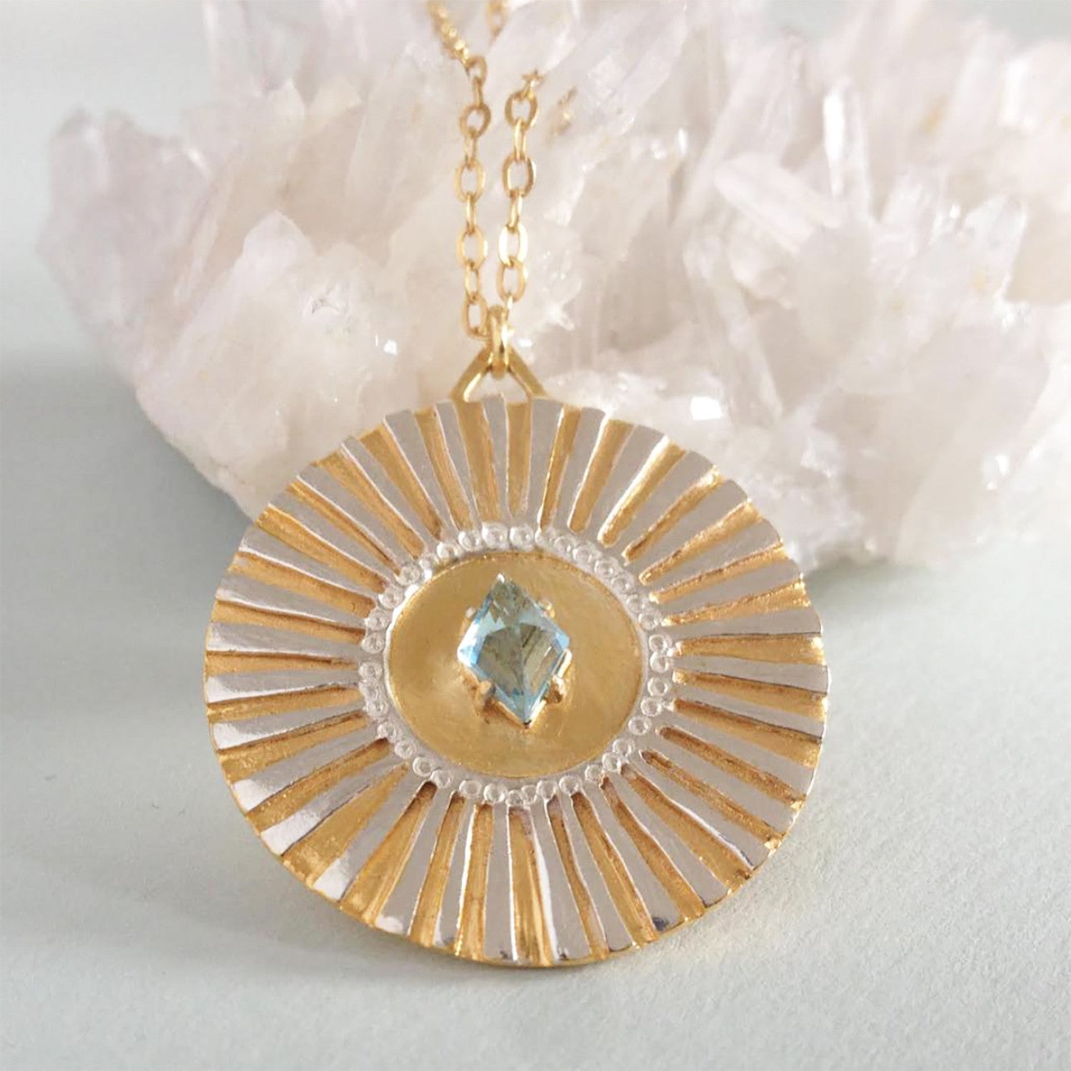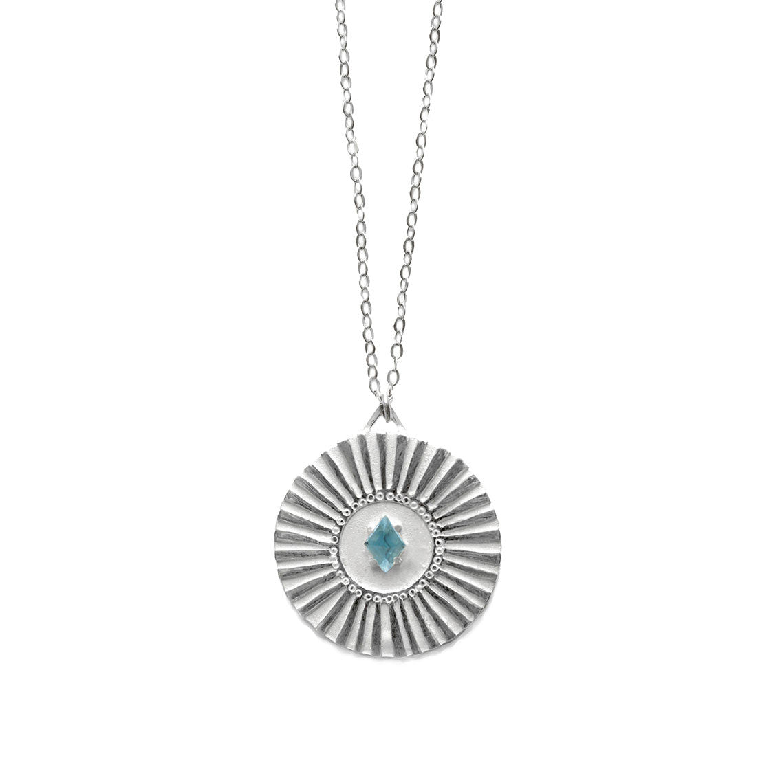 素材:このネックレスは、スターリングシルバーまたはゴールドヴェルメイユ(18金の重厚なゴールドプレートを施したシルバー)からお選びいただけます。石はブルートパーズまたはロードライトガーネットです。